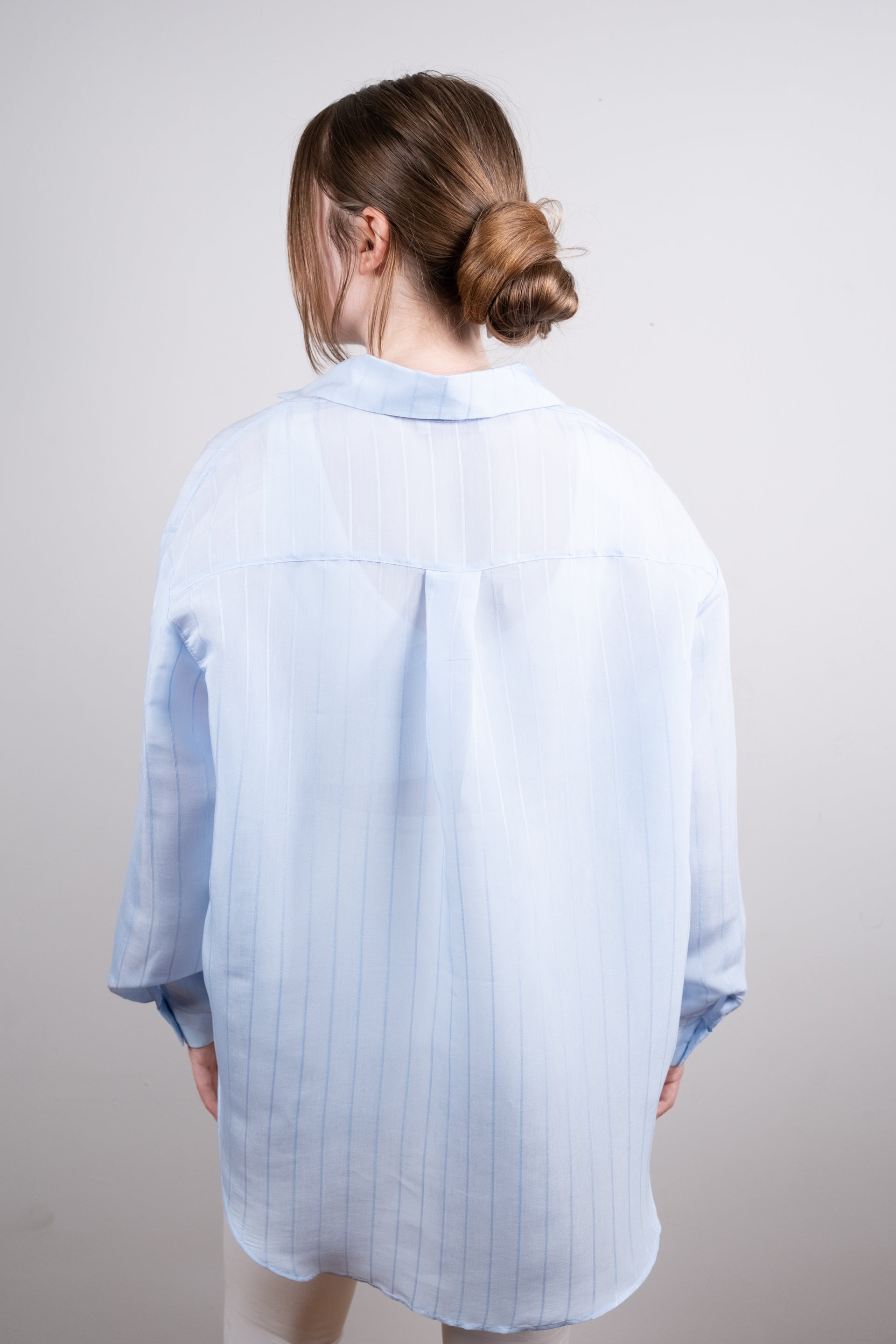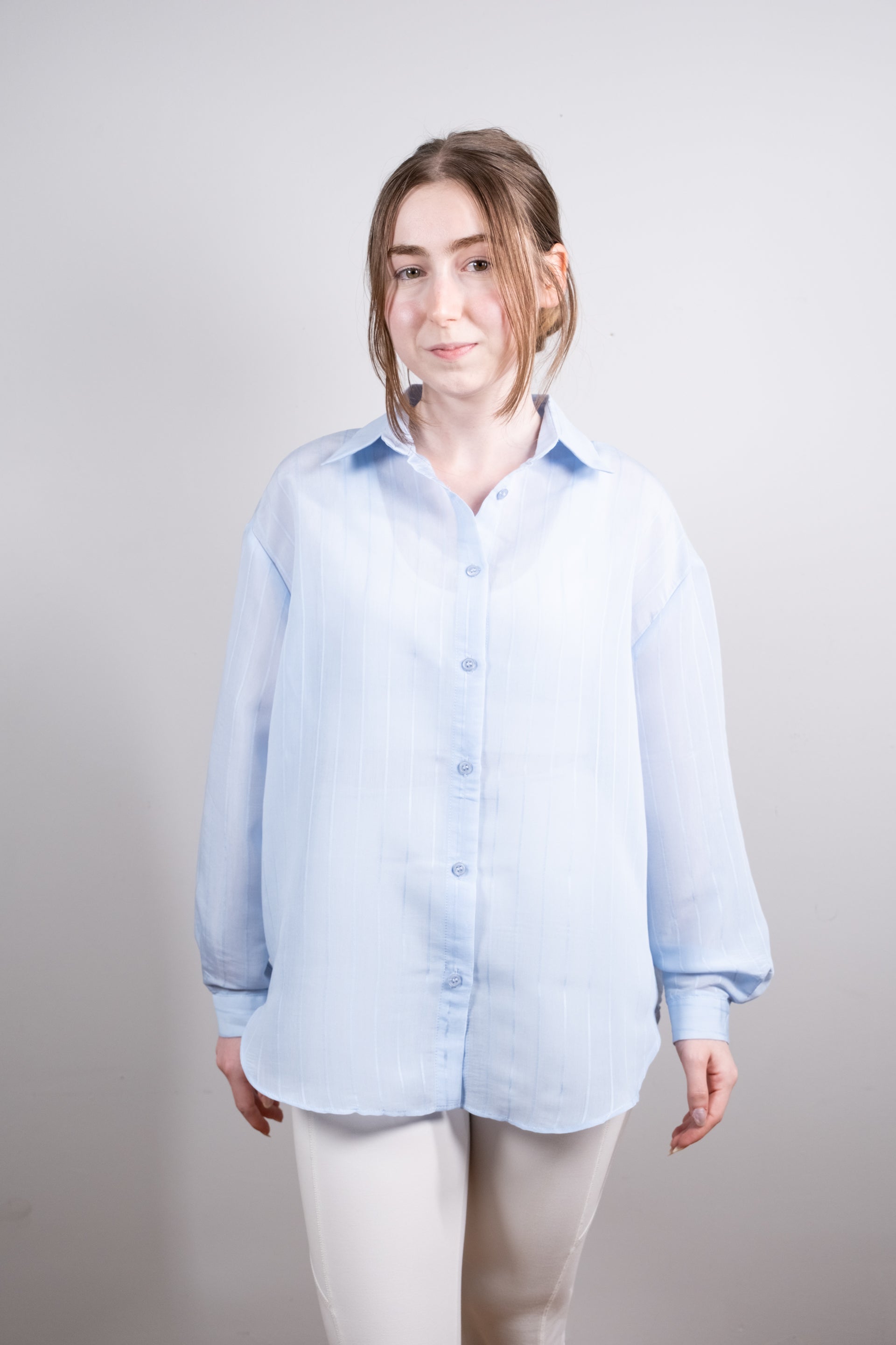 Hafif ve akıcı dokusuyla açık mavi şifon gömlek, zarif ve feminen bir görünüm sunar. Nefes alan yapısı sayesinde özellikle bahar ve yaz aylarında rahatlık sağlar. Modern kesimi ve şeffaf dokusu, ister günlük ister özel kombinlerde şık bir duruş kazandırır. Pantolon, etek ve şortlarla kolayca kombinlenebilir; katmanlı stillerde ise zarif bir tamamlayıcı olarak öne çıkar.