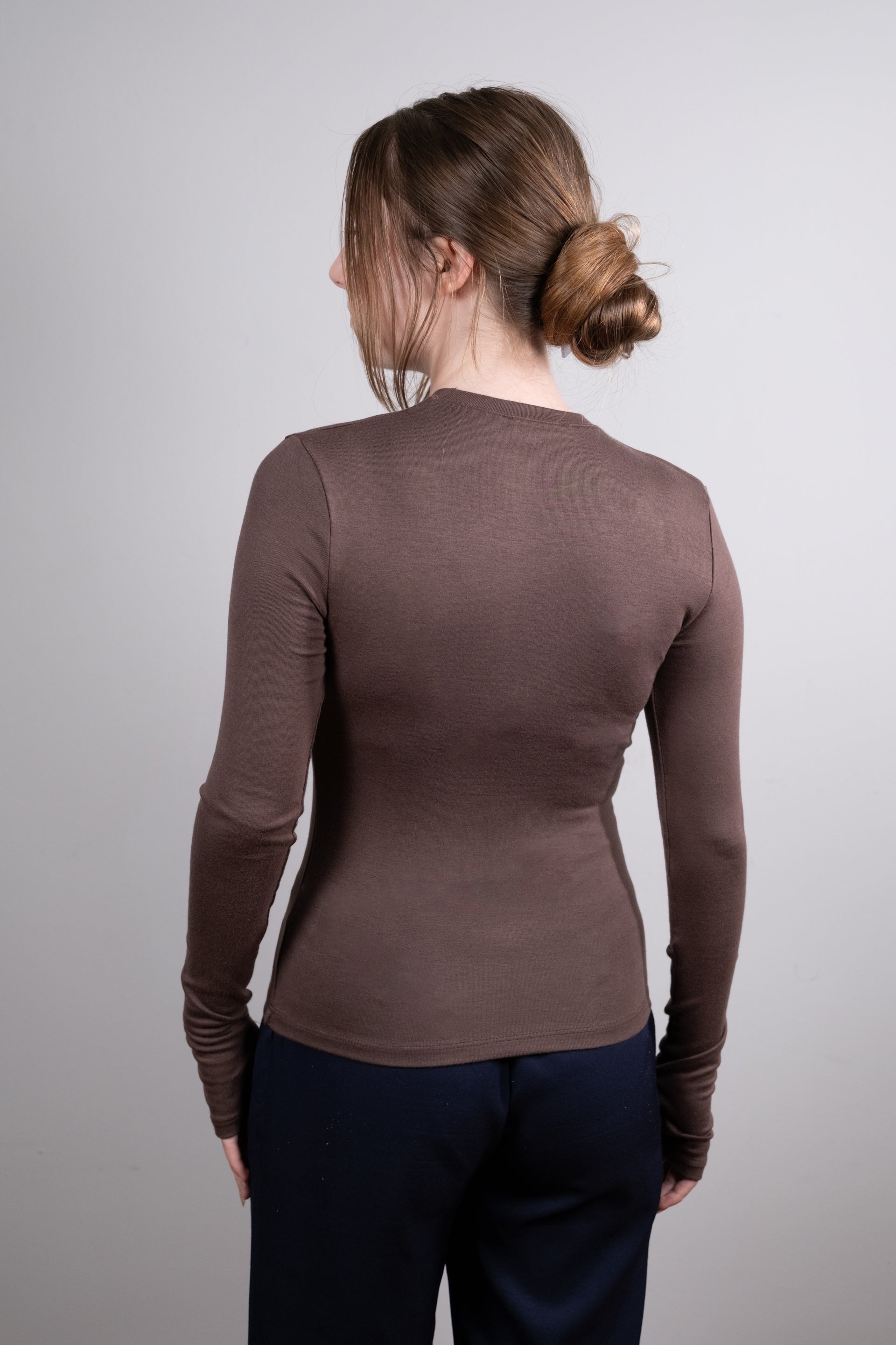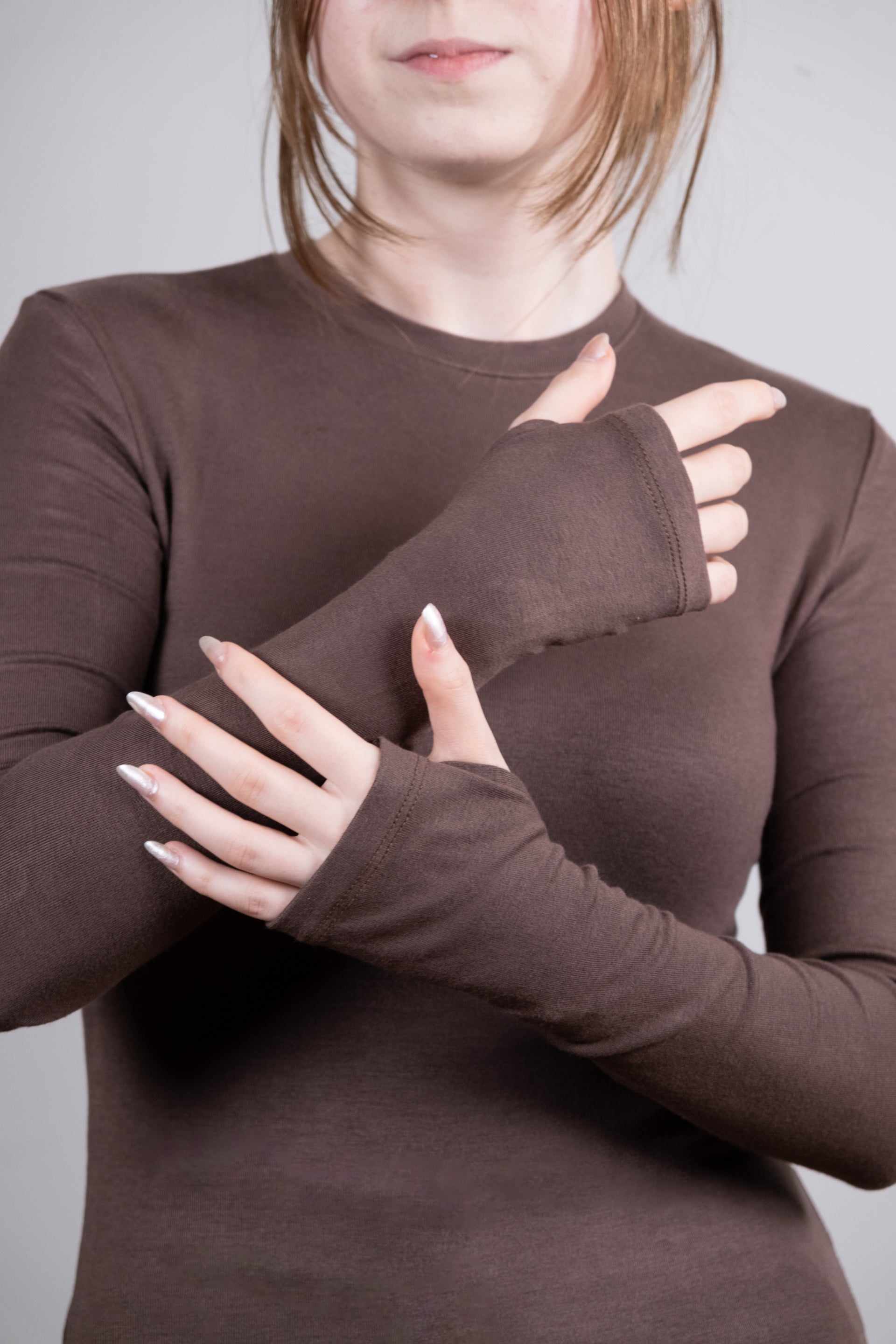 Sıcak kahverengi tonuyla öne çıkan parmak geçirmeli body, hem günlük hem de şık kombinlerde modern bir seçenek sunar. Parmak geçirmeli uzun kol detayı özgün bir görünüm sağlarken, vücuda oturan formu feminen bir silüet oluşturur. Yüksek bel pantolon, etek ve şortlarla kolayca kombinlenebilir; katmanlı kullanımlarda ise sofistike bir tamamlayıcı parça haline gelir.
