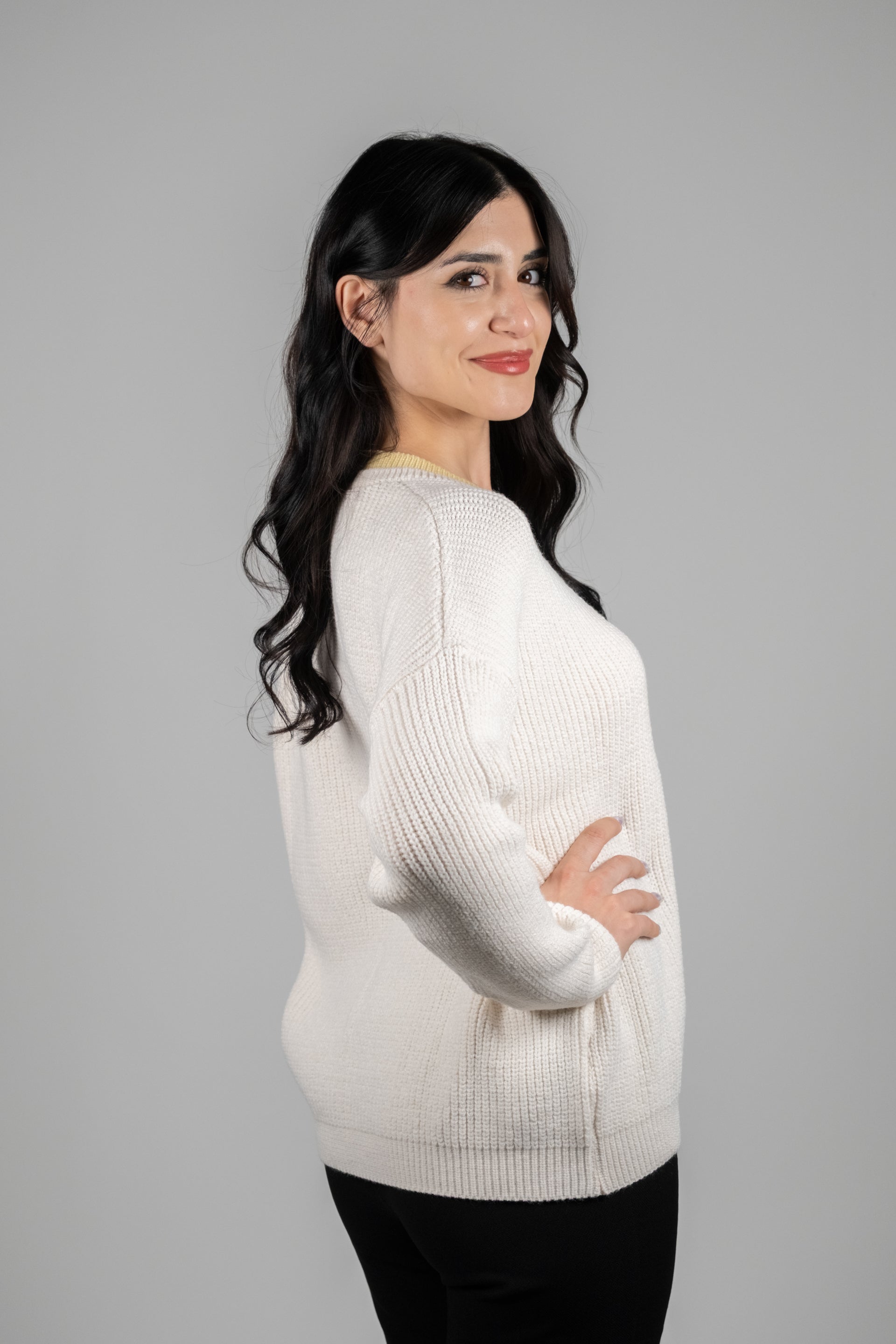 Krem tonunun zarifliğiyle buluşan bu triko, sarı yaka detayıyla sade şıklığa enerjik bir dokunuş katar. Yumuşak dokusu ve esnek formu sayesinde gün boyu rahat bir kullanım sunar. V yaka kesimiyle yüz hattını belirginleştirir, minimalist çizgisiyle hem tek başına hem de gömleklerle katmanlı şekilde kullanılabilir. Nötr tonlar ve pastel renklerle kolayca kombinlenerek modern ve canlı bir görünüm oluşturur.